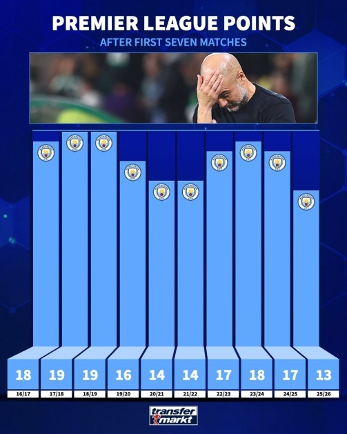 曼城本赛季英超前7轮仅积13分,瓜帅执教以来同期最低
