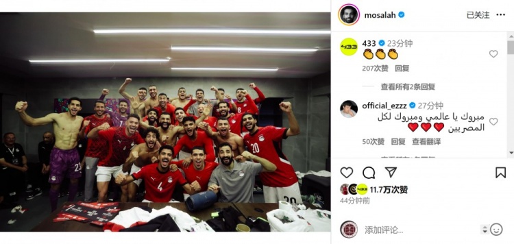 梅开二度!萨拉赫社媒晒全队更衣室合照,庆祝埃及进军世界杯