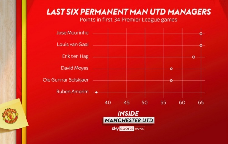 阿莫林在曼联前34场英超比赛仅拿37分,穆帅、范加尔均拿到65分